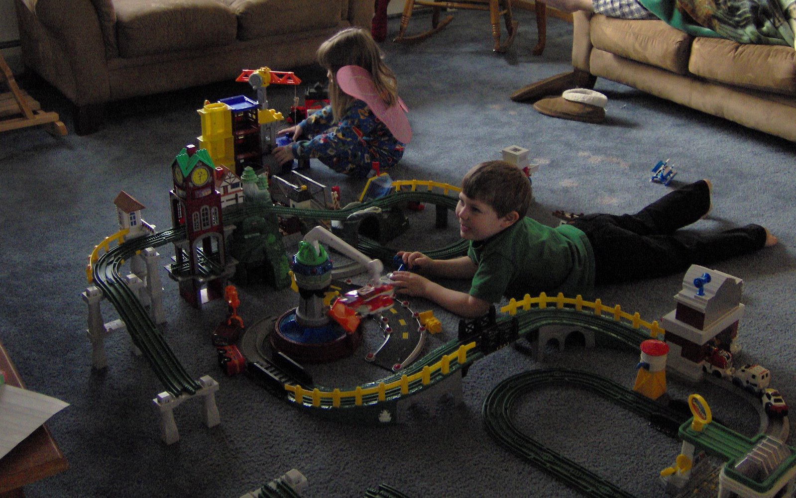 After weeks of Cort asking if he could get his boxes of GEO Trax out, I gave in and lugged in two and a half boxes of GEO Trax. He is totally enjoying them! I am not looking forward to telling him to put them all back in the boxes tonight. He has so many that the only place he can set them up is in the living room. I am sorry Cort , I am not going to decorate my living room in GEO Trax. I know that I will have to come up with something better. Maybe once a week we can pull them out? Cort and I will have to discuss this further.